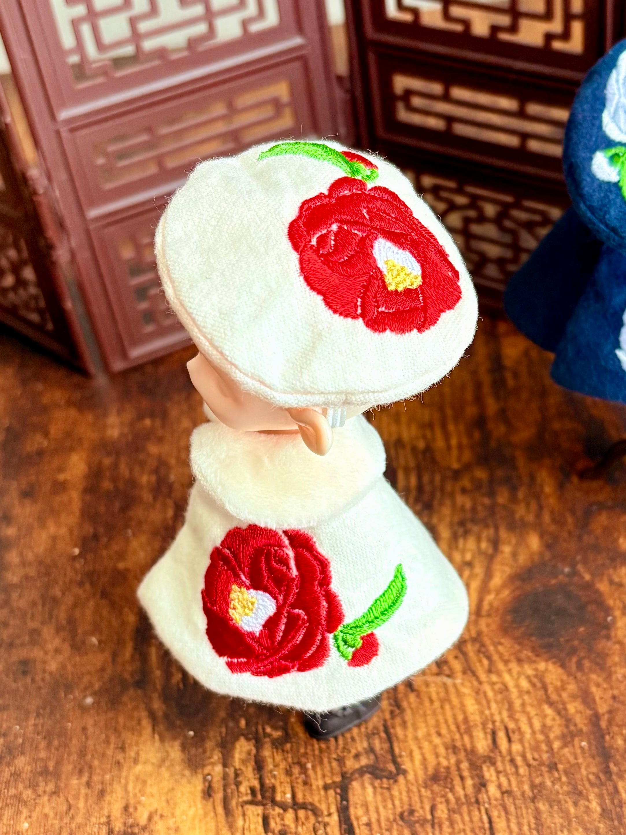 和装にも洋装にも似合う、椿の花をイメージしたケープとベレー帽のセットです。
