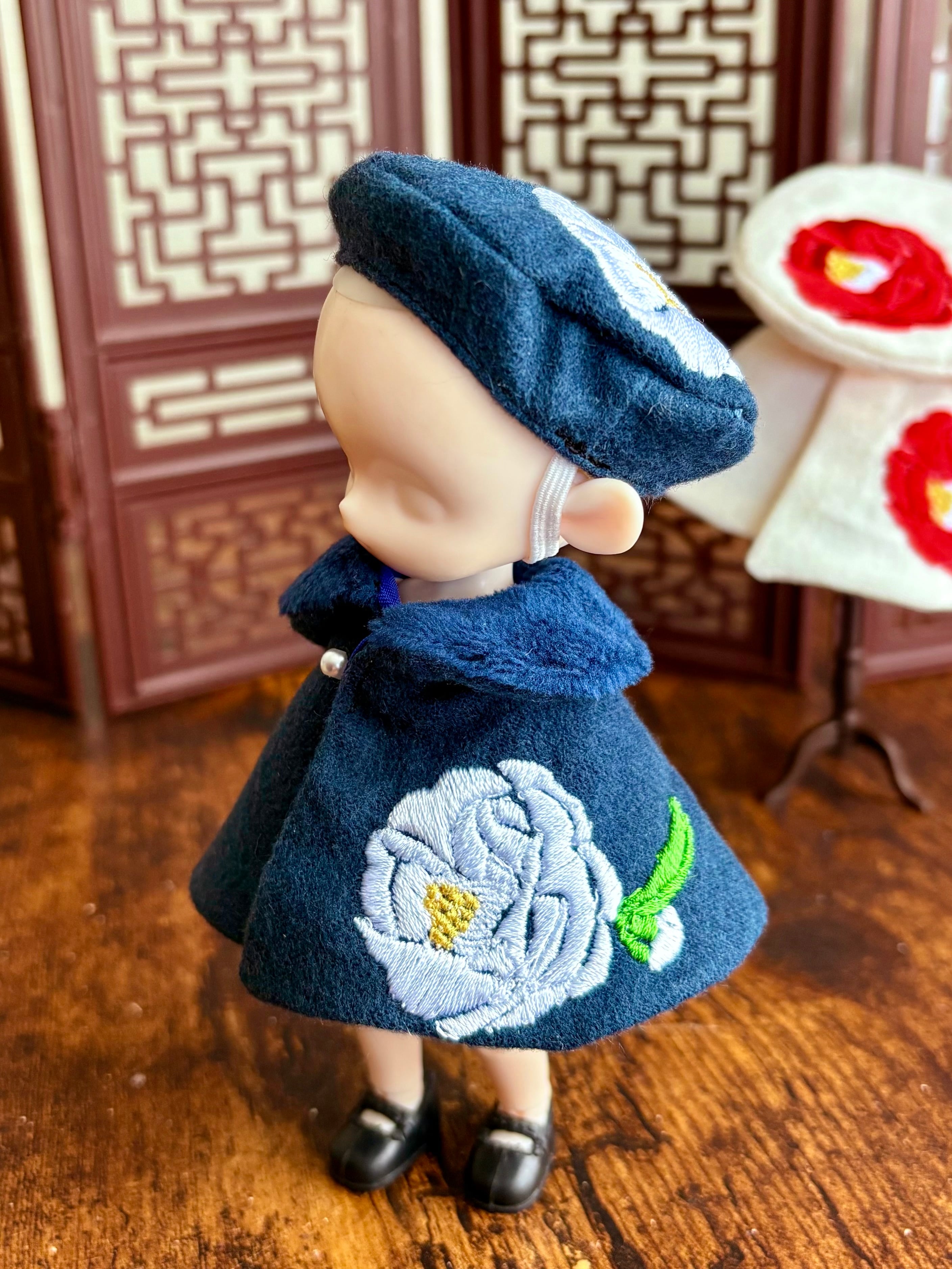 和装にも洋装にも似合う、椿の花をイメージしたケープとベレー帽のセットです。